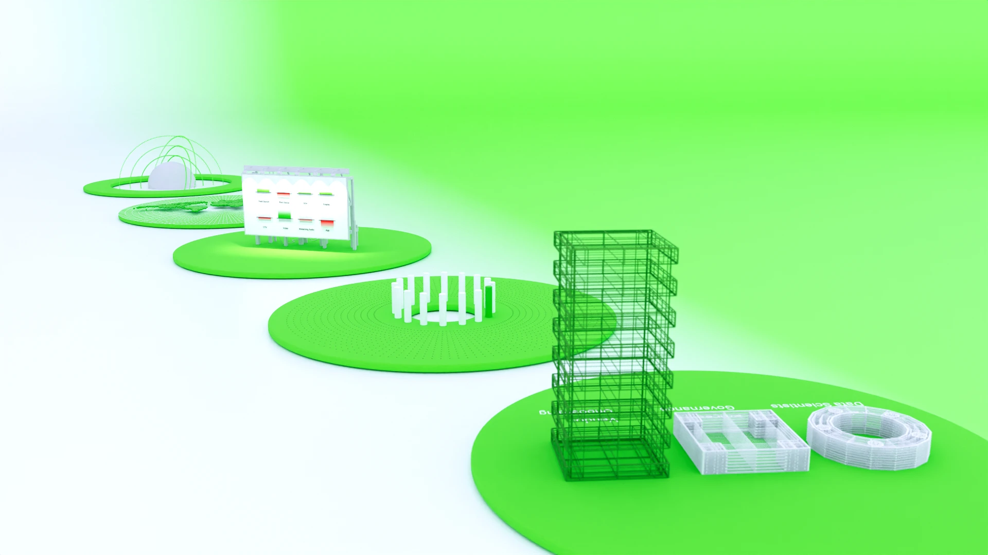 All case studies were designed to exist within a single shared studio environment, creating consistency while allowing each story to retain its own identity. Each narrative sits on its own podium, able to stand independently or connect with others as part of a wider system that can scale as new stories are introduced.